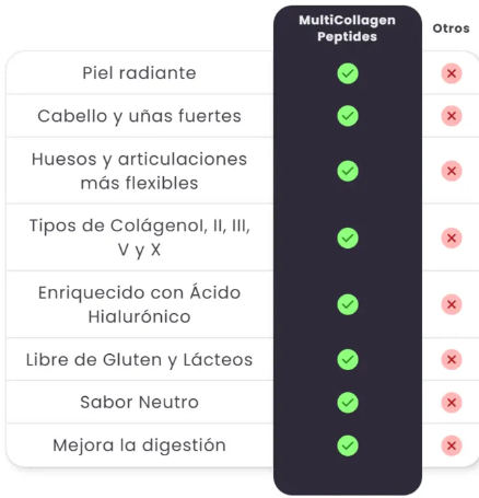 Este suplemento ayuda a mejorar la salud de la piel, cabello, uñas, articulaciones, huesos y músculos. Combina 5 tipos de colágeno que actúan en diferentes áreas del cuerpo, junto a biotina, vitamina C y ácido hialurónico para potenciar los resultados.
